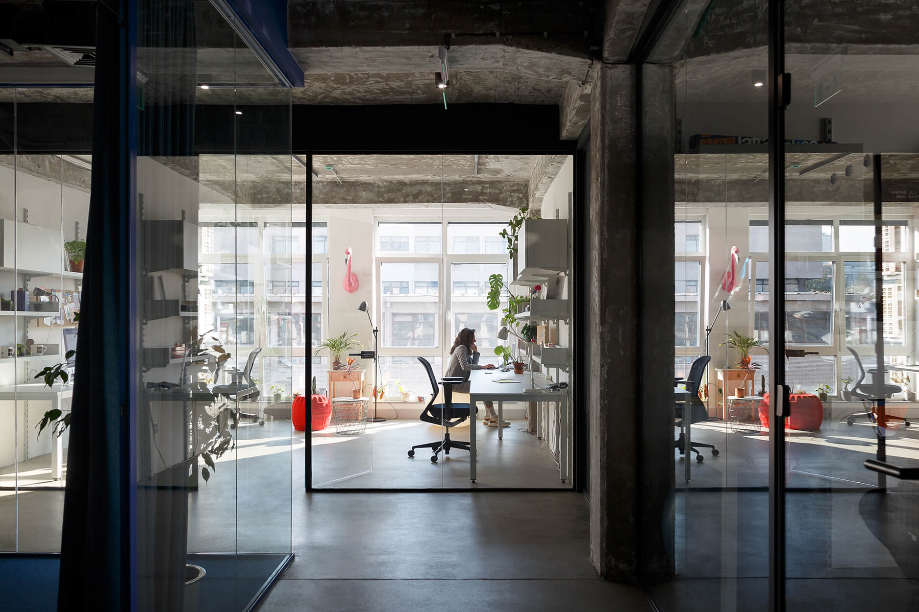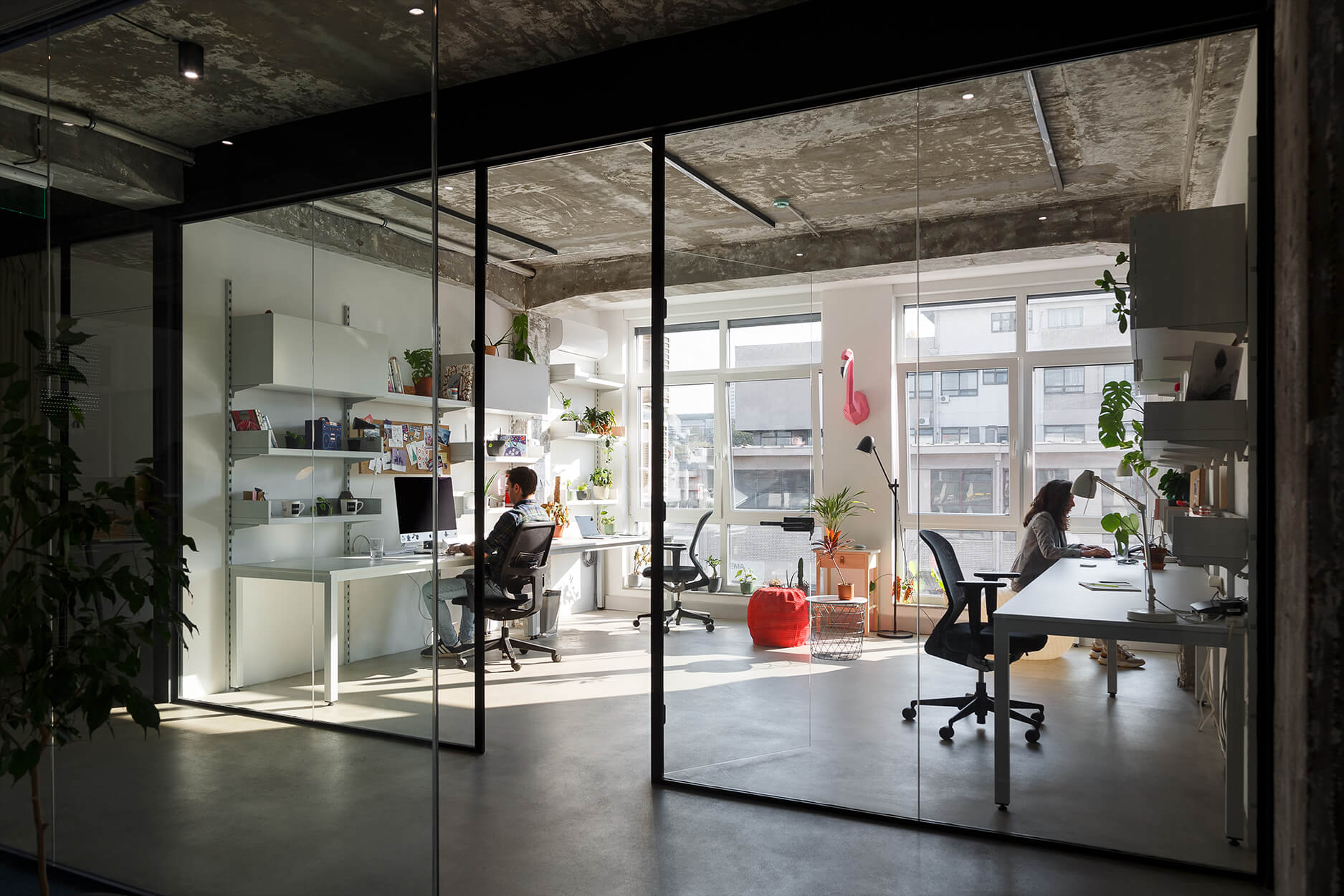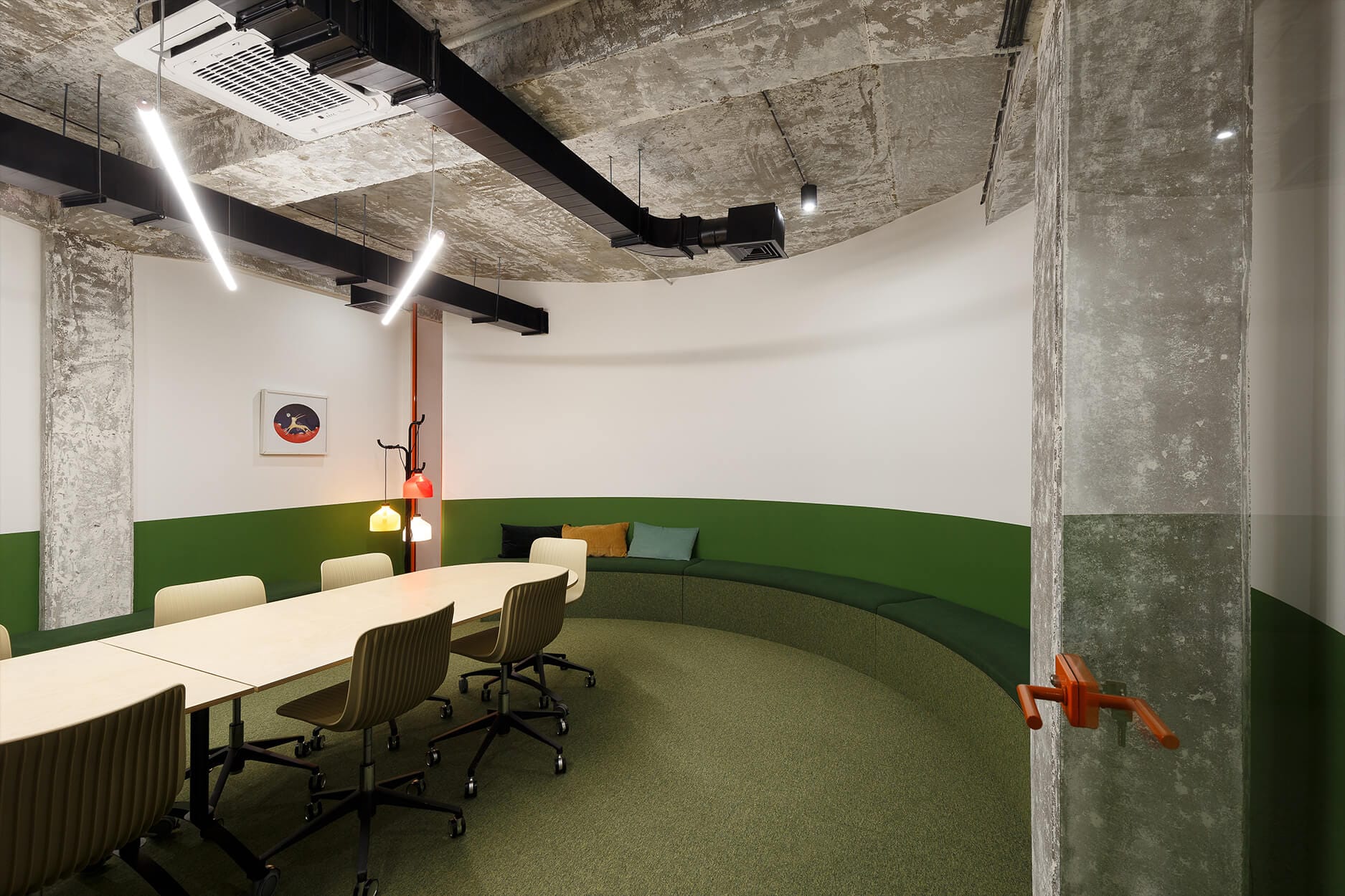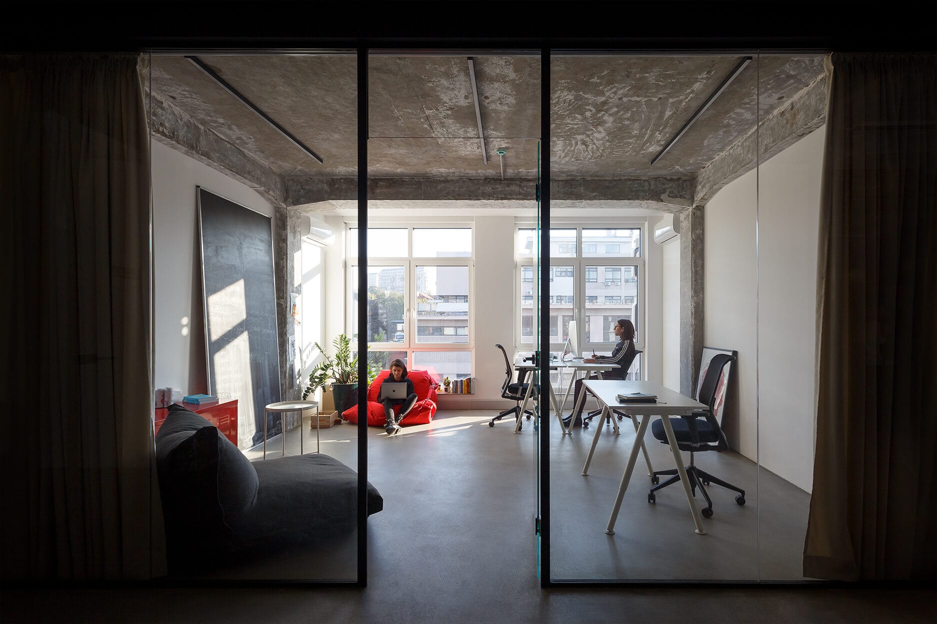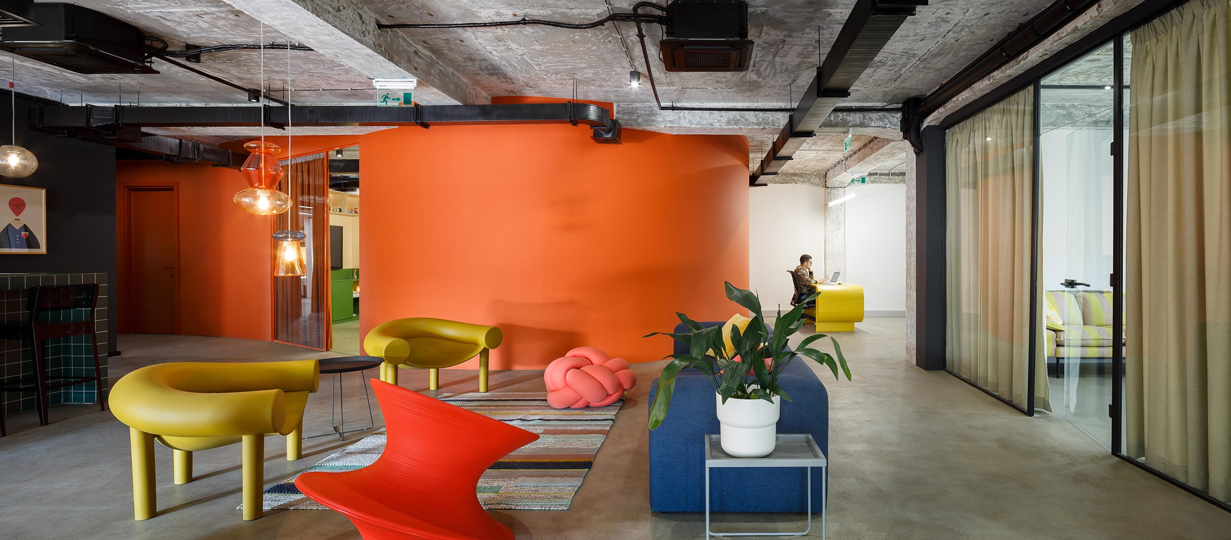 This office space near the Port of Belgrade was designed for a Belgrade-based creative agency. The interior is conceived as an open and dynamic environment where the existing structure of the building is kept visible. Concrete columns, beams, and exposed ceiling installations remain an important part of the space, forming a strong industrial background. Functional units are introduced as independent elements, creating a modular layout that coexists with the building’s raw character.