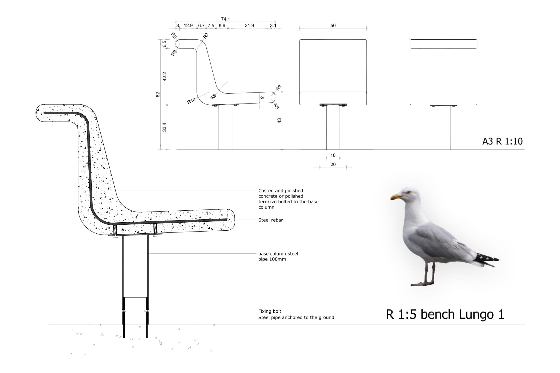 The form of the bench is derived from the silhouette of a seagull at rest. The bench is designed in local stone, in relation to the character of the coastal environment.