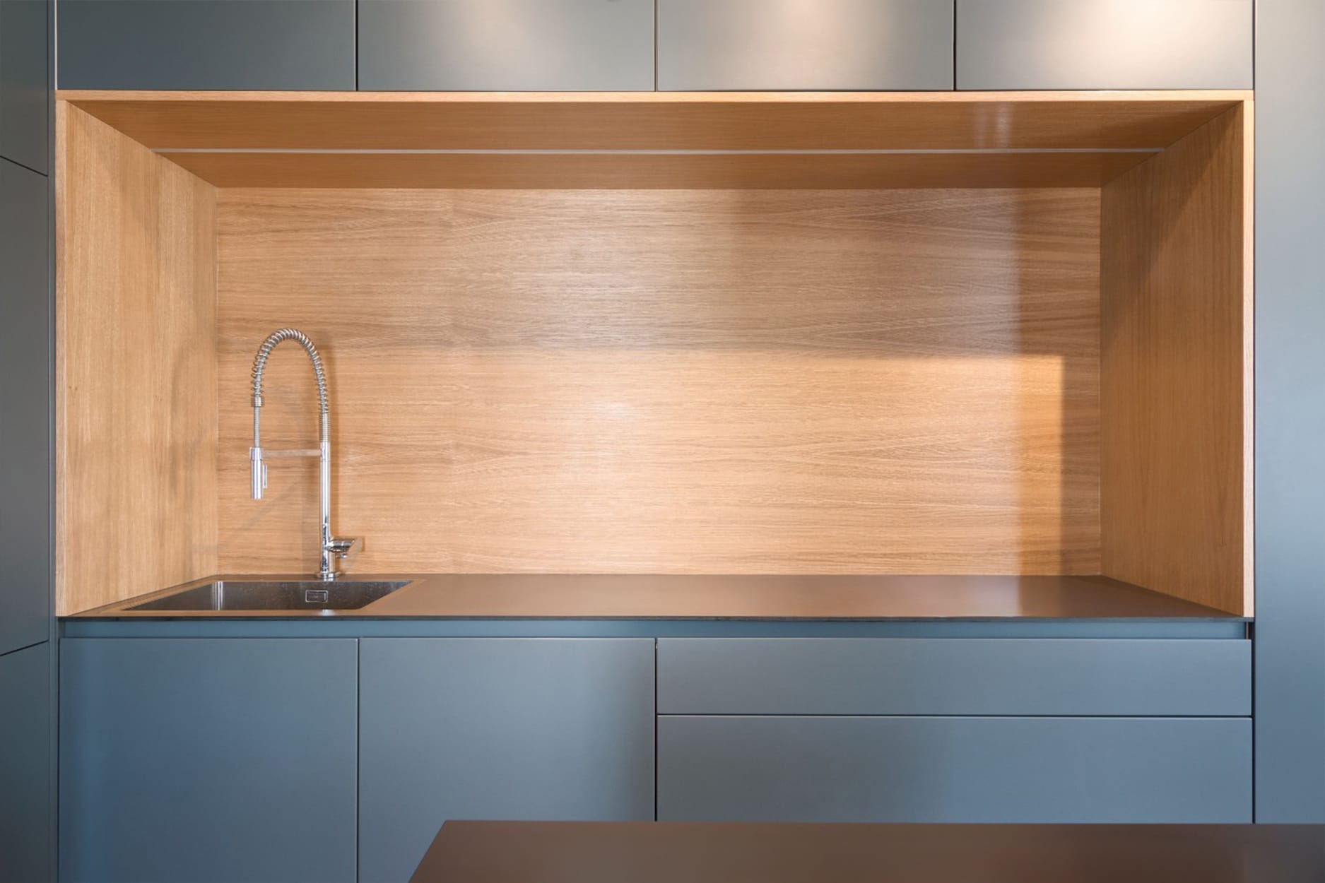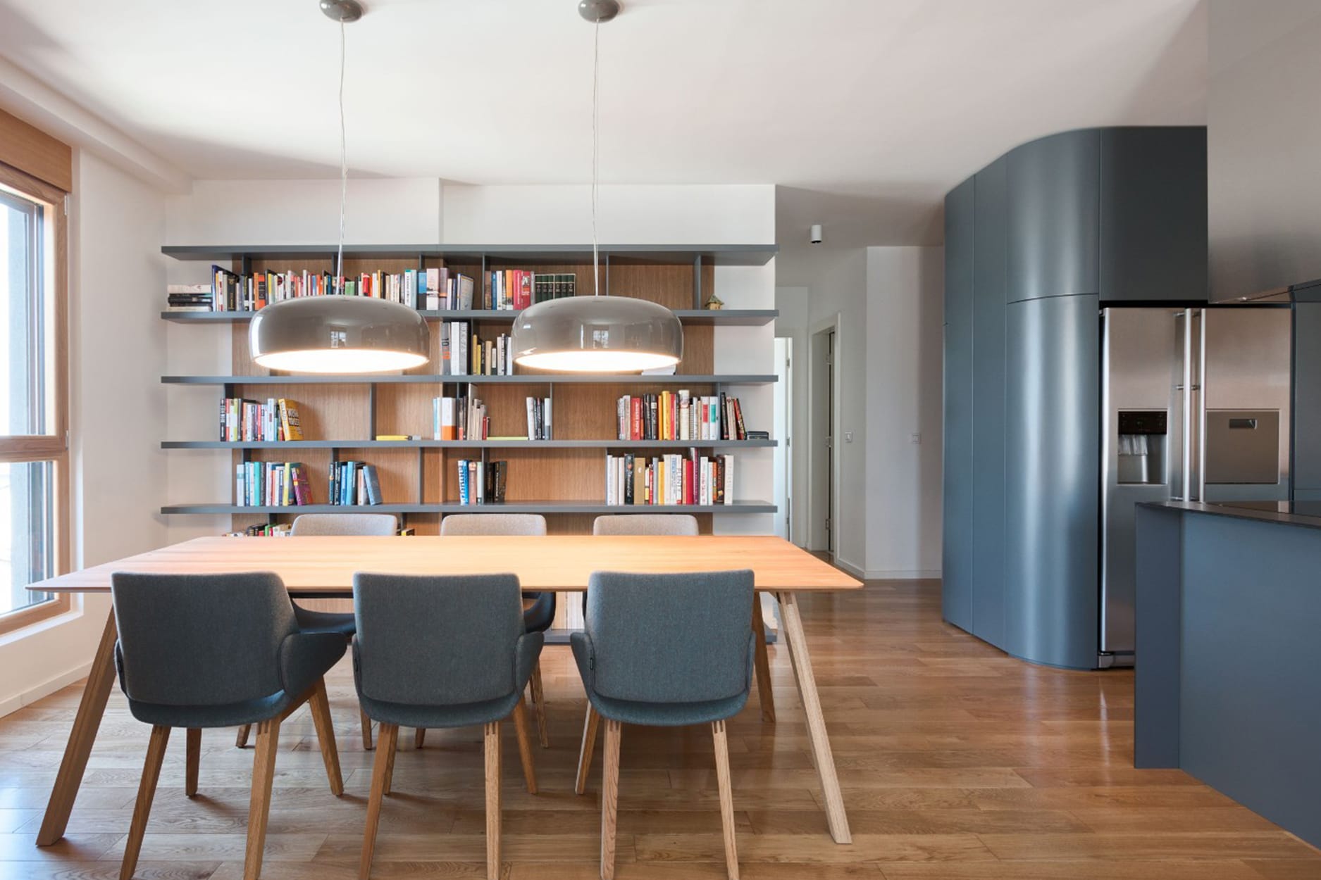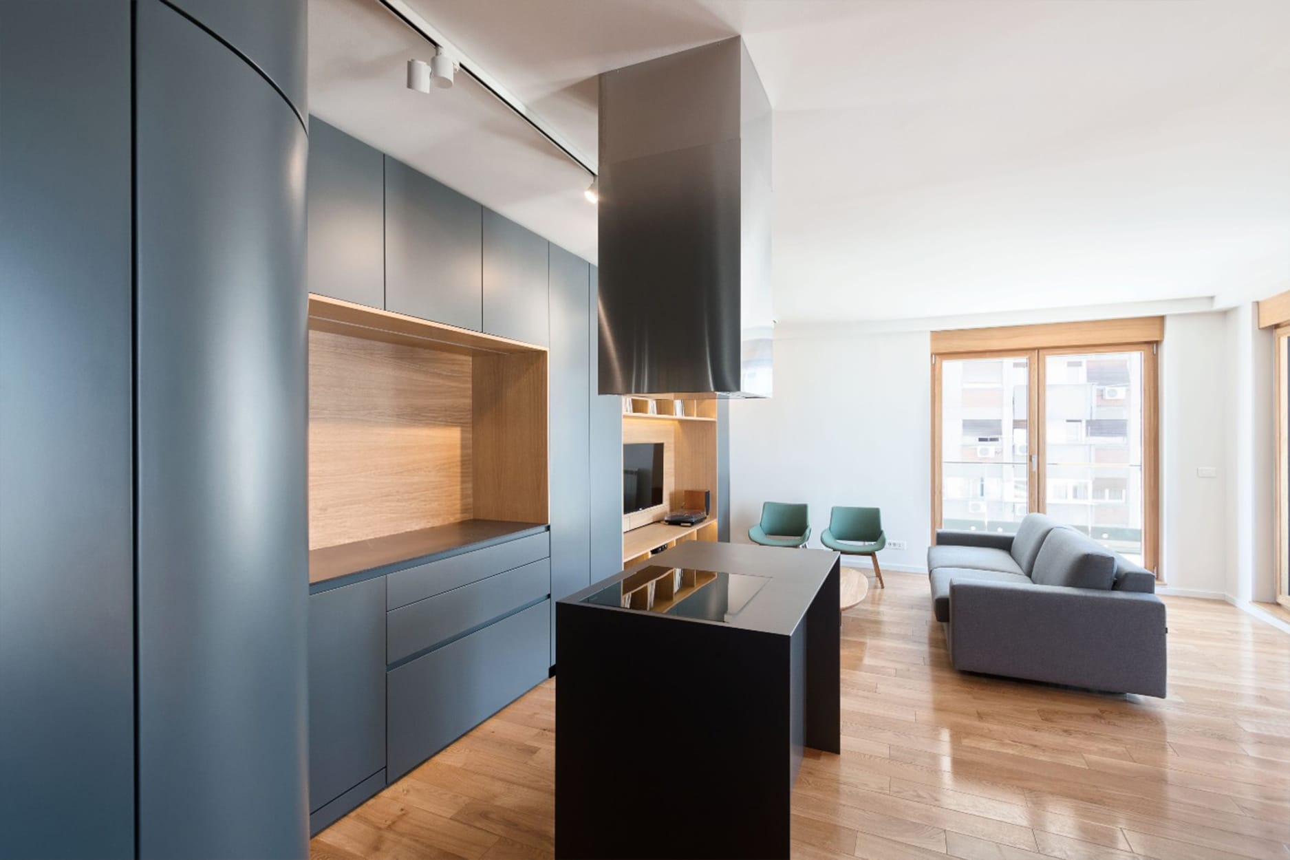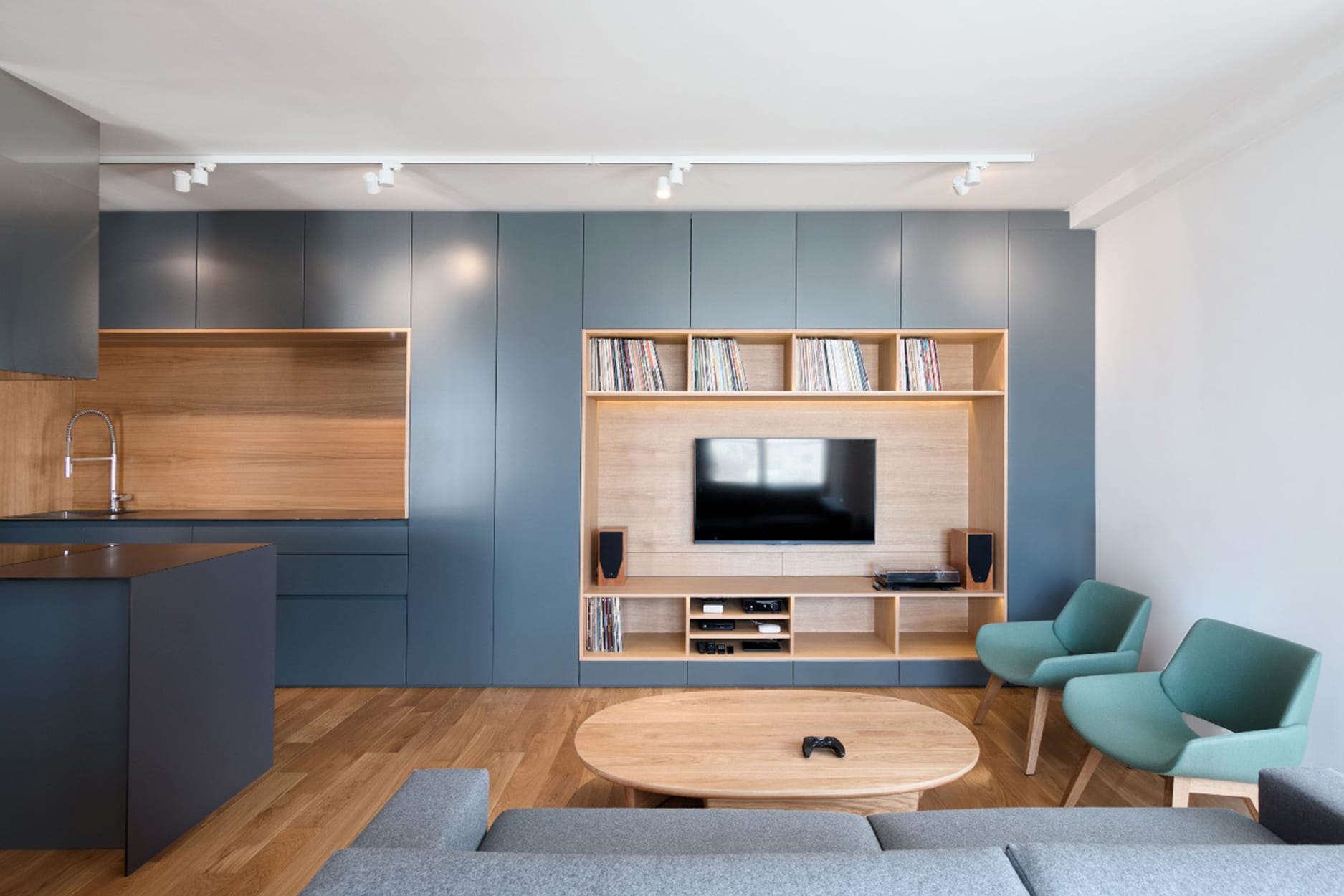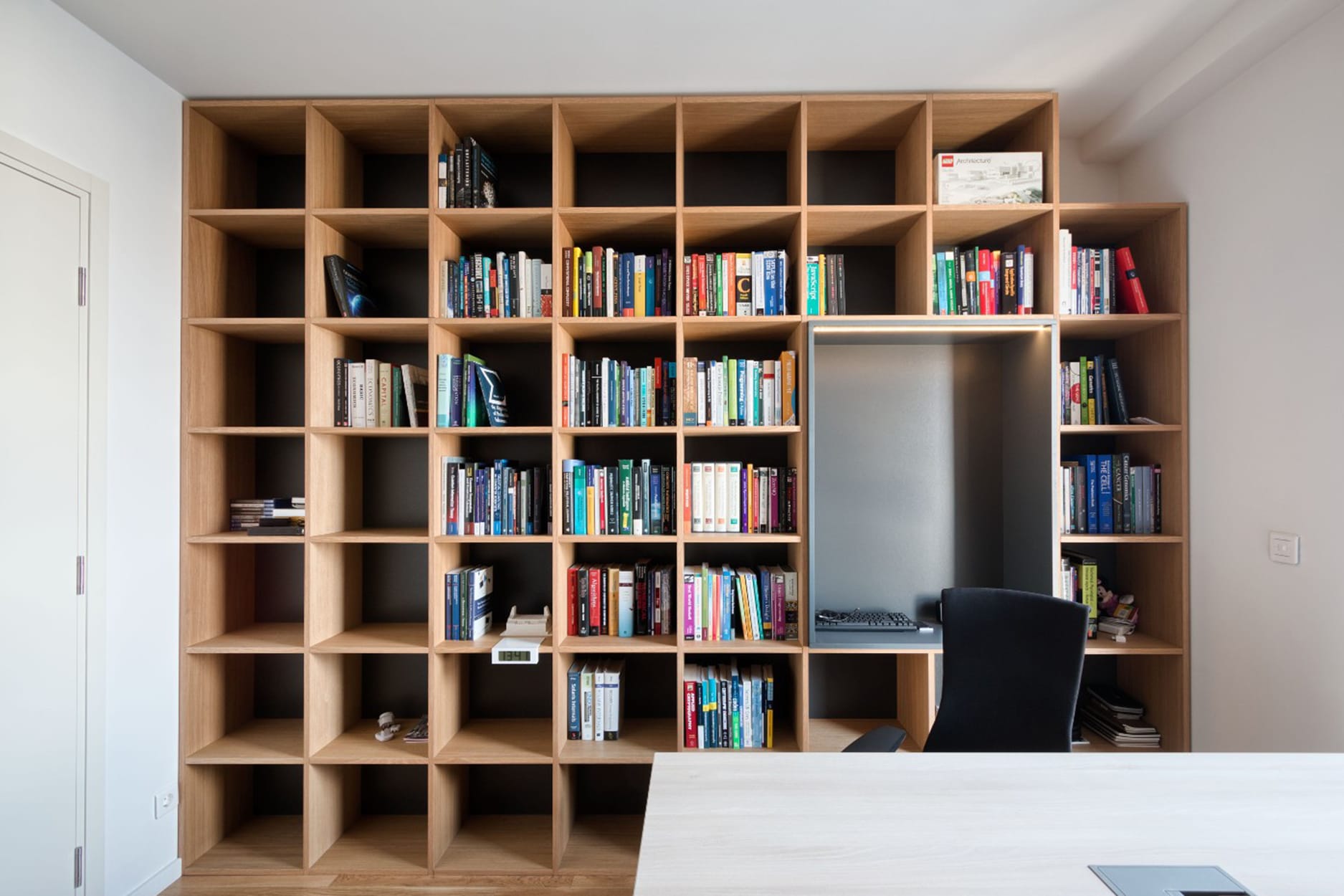The concept of the Niche apartment is based on integrating functional niches within built-in elements throughout the interior. Storage units such as wardrobes, the kitchen, and the library are designed as continuous architectural volumes that incorporate recessed niches with different purposes.