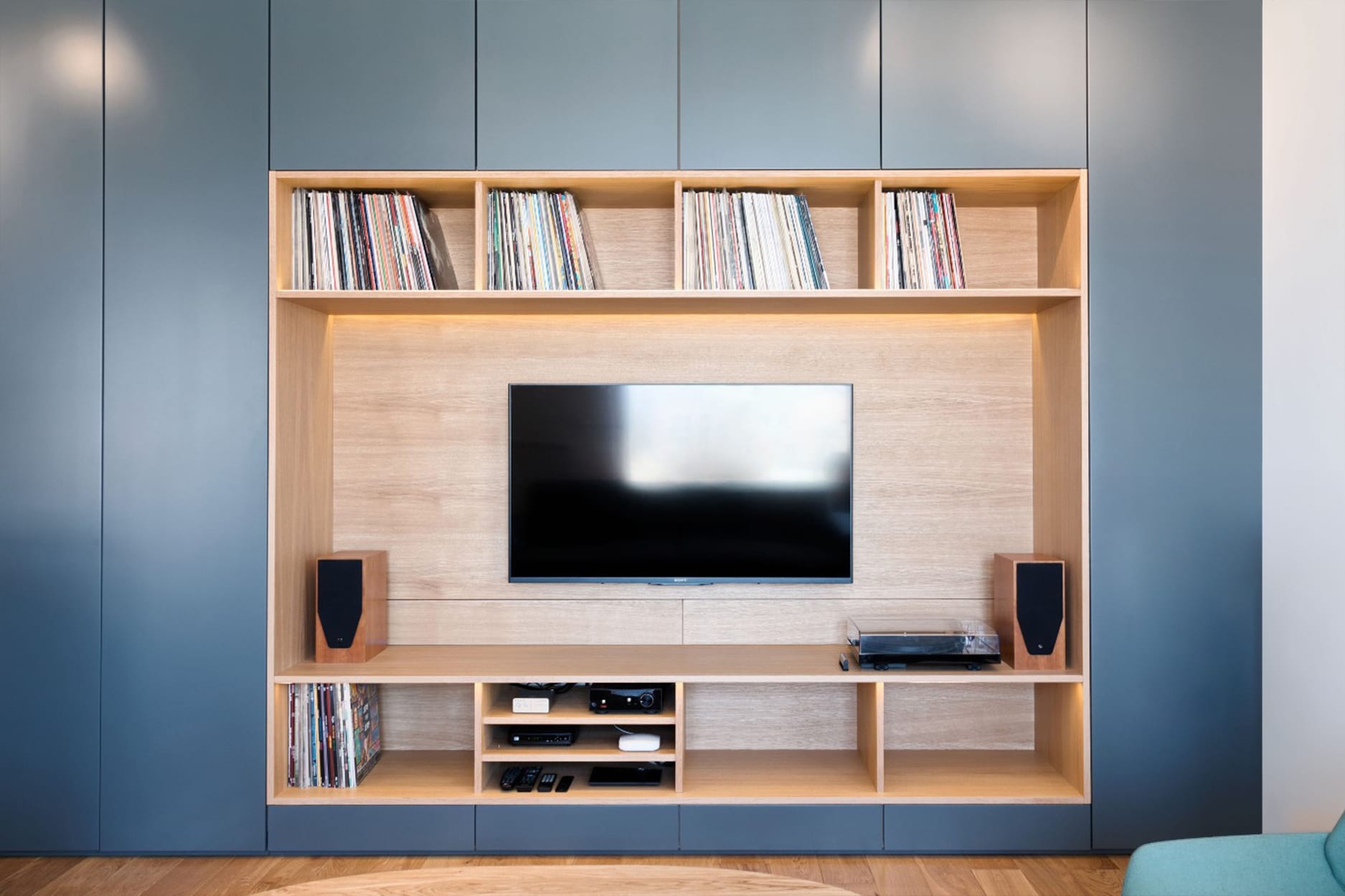 These niches create small moments of function within the larger elements spaces for display, reading, seating, or everyday use. By embedding these varied functions into the built-in furniture, the apartment achieves a clean and cohesive spatial composition while maintaining flexibility and character.