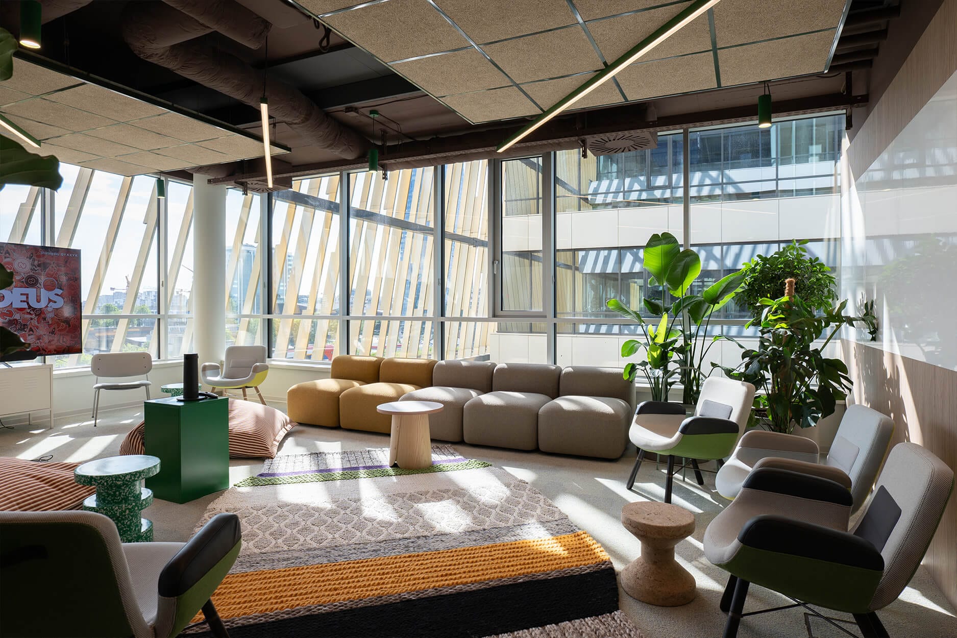 This is our fourth collaboration with Nordeus. After six years, they felt the need to explore how their workspace could evolve through the idea of an annexed satellite office. As life and work habits change faster than ever, workspaces must respond both to current ways of working and to future needs. The goal was to create an environment that supports teams today, while remaining flexible and adaptable for tomorrow.